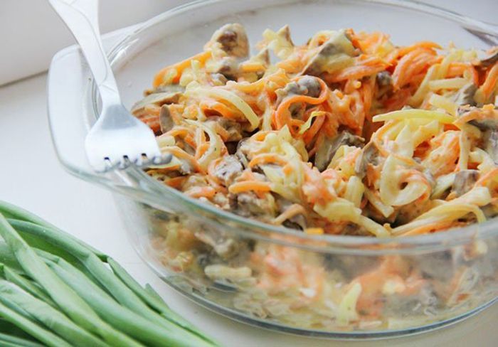 Салат из сердца с морковью и маринованным луком. Для приготовления салата из сердца с морковью можно использовать говяжье или куриное сердце.